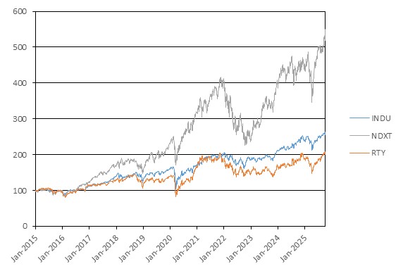 The graph below illustrates the daily performance of the underlying assets from January 1, 2015 through October 10, 2025. For comparison purposes, each underlying asset has been normalized to have a closing level of 100.00 on January 1, 2015 by dividing the closing level of that underlying asset on each trading day by the closing level of that underlying asset on January 1, 2015 and multiplying by 100.00. We obtained the closing levels used to determine the normalized closing levels set forth below from Bloomberg, without independent verification.