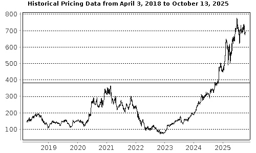 The graph below illustrates the performance of Spotify's common stock for the period indicated, based on the daily closing levels as reported by Bloomberg, without independent verification. UBS has not conducted any independent review or due diligence of any publicly available information obtained from Bloomberg. The solid line represents its coupon barrier and downside threshold of $380.62, which is equal to 55.00% of the closing level on October 13, 2025. Past performance of the underlying asset is not indicative of the future performance of the underlying asset during the term of the Notes. |