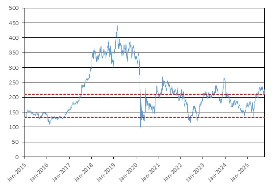 The graph below illustrates the performance of Boeing’s common stock from January 1, 2015 through October 10, 2025, based on the daily closing levels as reported by Bloomberg, without independent verification. UBS has not conducted any independent review or due diligence of any publicly available information obtained from Bloomberg. The closing level of Boeing’s common stock on October 10, 2025 was $210.73. The dotted lines respectively represent the call threshold level of $210.73, which is equal to 100.00% of the initial level, and the coupon barrier and downside threshold of $132.97, which is equal to 63.10% of the initial level. Past performance of the underlying asset is not indicative of the future performance of the underlying asset during the term of the Notes.