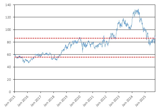 The graph below illustrates the performance of Merck’s common stock from January 1, 2015 through October 10, 2025, based on the daily closing levels as reported by Bloomberg, without independent verification. UBS has not conducted any independent review or due diligence of any publicly available information obtained from Bloomberg. The closing level of Merck’s common stock on October 10, 2025 was $85.99. The dotted lines respectively represent the call threshold level of $85.99, which is equal to 100.00% of the initial level, and the coupon barrier and downside threshold of $55.72, which is equal to 64.80% of the initial level. Past performance of the underlying asset is not indicative of the future performance of the underlying asset during the term of the Notes.