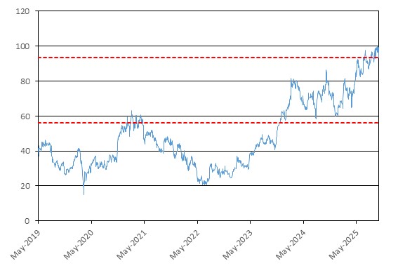 The graph below illustrates the performance of Uber’s common stock from May 10, 2019 through October 10, 2025, based on the daily closing levels as reported by Bloomberg, without independent verification. UBS has not conducted any independent review or due diligence of any publicly available information obtained from Bloomberg. The closing level of Uber’s common stock on October 10, 2025 was $93.40. The dotted lines respectively represent the call threshold level of $93.40, which is equal to 100.00% of the initial level, and the coupon barrier and downside threshold of $56.04, which is equal to 60.00% of the initial level. Past performance of the underlying asset is not indicative of the future performance of the underlying asset during the term of the Notes.