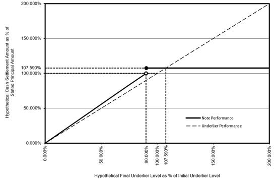 The following chart also shows a graphical illustration of the hypothetical cash settlement amounts that we would pay on your notes on the maturity date, if the final underlier level (expressed as a percentage of the initial underlier level) were any of the hypothetical levels shown on the horizontal axis. The chart shows that any hypothetical final underlier level (expressed as a percentage of the initial underlier level) of less than 90.000% (the section left of the 90.000% marker on the horizontal axis) would result in a hypothetical cash settlement amount of less than 100.000% of the stated principal amount of your notes (the section below the 100.000% marker on the vertical axis) and, accordingly, in a loss of principal to the holder of the notes. The chart also shows that any hypothetical final underlier level (expressed as a percentage of the initial underlier level) of greater than or equal to 90.000% (the section right of the 90.000% marker on the horizontal axis) would result in a capped return on your investment.