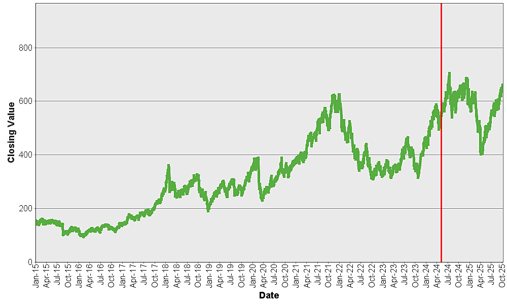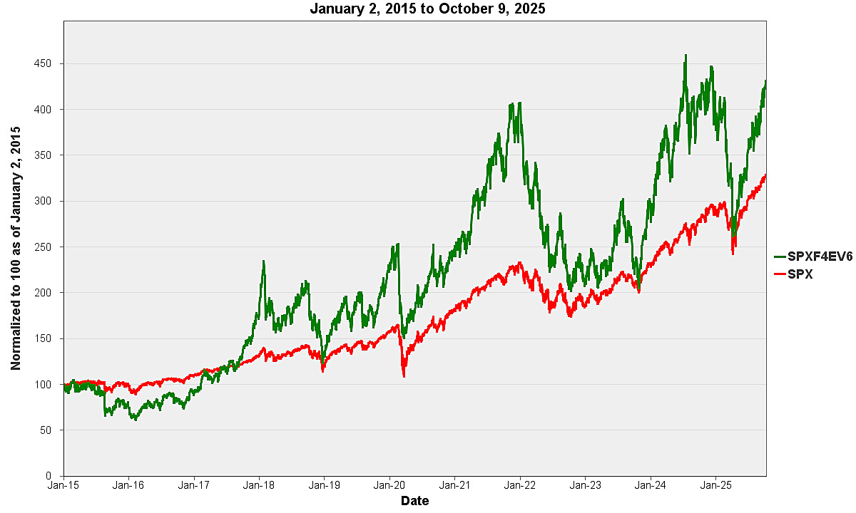 The following graph sets forth a comparison of the historical performance of the S&P 500 Futures Excess Return Index against the historical performance of the S&P 500® Index from January 2, 2015 through October 9, 2025, each normalized to have a closing value of 100.00 on January 2, 2015 to facilitate a comparison. The performance of the S&P 500® Index shown below is its price return performance – i.e., its performance without reflecting dividends. The total return performance of the S&P 500® Index (i.e., its performance reflecting dividends) would be greater than the price return performance shown below.