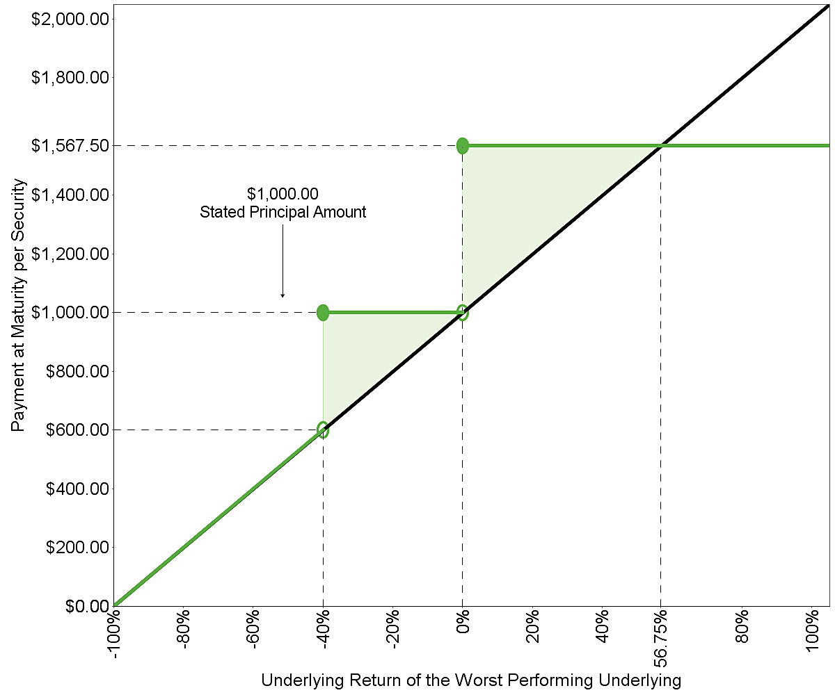 Example 3—Downside Scenario. The final underlying value of the worst performing underlying on the final valuation date is 30.00, resulting in a -70.00% underlying return for the worst performing underlying on the final valuation date. In this example, the final underlying value of the worst performing underlying on the final valuation date is less than its final barrier value.
