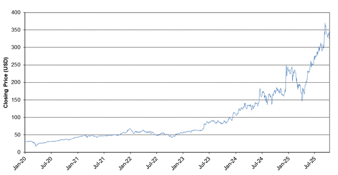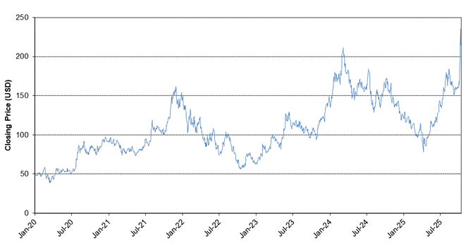 The graph below sets forth the historical performance of the AVGO Underlier based on the daily Closing Values from January 2, 2020 through October 10, 2025. We obtained the Closing Values shown in the graph below from Bloomberg. We have not independently verified the accuracy or completeness of the information obtained from Bloomberg. The Closing Values below may reflect adjustments in response to certain corporate actions, such as stock splits, public offerings, mergers and acquisitions, spin-offs, extraordinary dividends, delistings and bankruptcy.