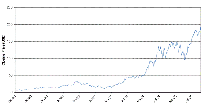 The graph below sets forth the historical performance of the NVDA Underlier based on the daily Closing Values from January 2, 2020 through October 10, 2025. We obtained the Closing Values shown in the graph below from Bloomberg. We have not independently verified the accuracy or completeness of the information obtained from Bloomberg. The Closing Values below may reflect adjustments in response to certain corporate actions, such as stock splits, public offerings, mergers and acquisitions, spin-offs, extraordinary dividends, delistings and bankruptcy.