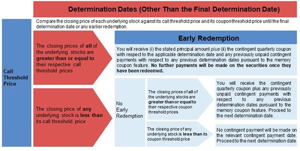 If the closing prices of all of the underlying stocks on any determination date other than the final determination date are greater than or equal to their respective call threshold prices, the securities will be automatically redeemed for an amount per security equal to the early redemption payment on the first contingent coupon payment date