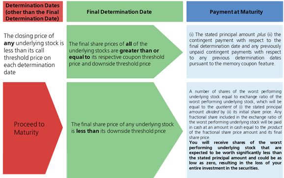 date is less than its coupon threshold price, such contingent quarterly coupon will be paid on a later contingent coupon payment date if the closing price of all of the underlying stocks on the determination date corresponding to such later