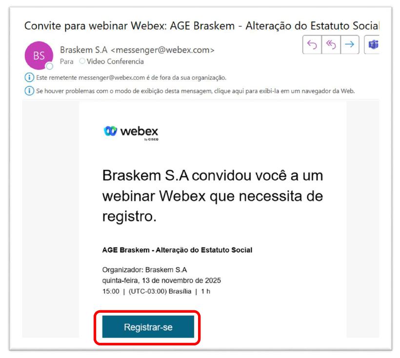 The shareholders of BRASKEM S.A. (“Shareholders” and “Company”, respectively) are hereby called to meet at an Extraordinary General Meeting, in an exclusively digital manner, pursuant to article 5, paragraph 2, item I, and article 28, paragraphs 2 and 3, of CVM Resolution No. 81, (“CVM Resolution 81”), to be held on November 13, 2025, at 3:00 p.m., through digital platform Webex (“Digital Platform” and “Meeting”, respectively), to resolve upon the following Agenda: