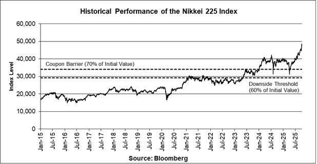 The graph below illustrates the daily performance of the Nikkei 225 Index from January 5, 2015 through October 9, 2025, based on information from Bloomberg, without independent verification. The closing level of the Nikkei 225 Index on October 9, 2025 was 48,580.44. We obtained the closing levels of the Nikkei 225 Index above and below from Bloomberg, without independent verification.