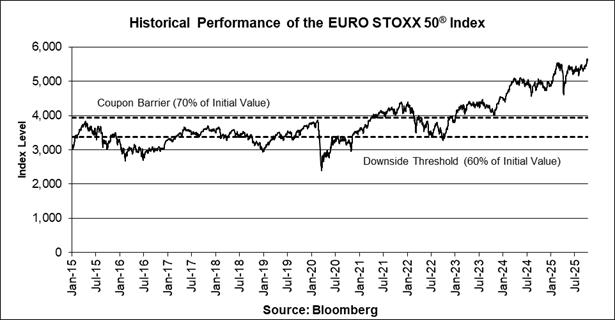 The graph below illustrates the daily performance of the EURO STOXX 50® Index from January 2, 2015 through October 9, 2025, based on information from Bloomberg, without independent verification. The closing level of the EURO STOXX 50® Index on October 9, 2025 was 5,625.56. We obtained the closing levels of the EURO STOXX 50® Index above and below from Bloomberg, without independent verification.