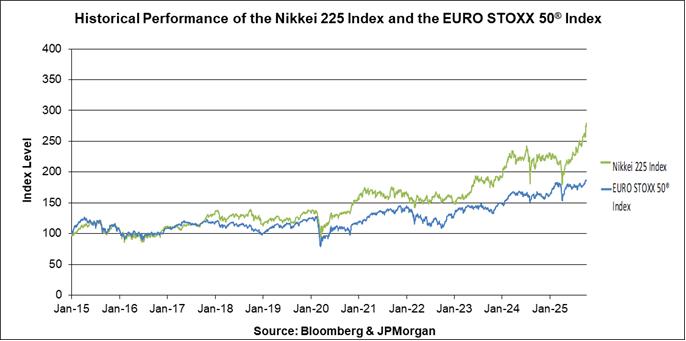 The graph below illustrates the daily performance of the Nikkei 225 Index and the EURO STOXX 50® Index from January 5, 2015 through October 9, 2025. For comparison purposes, each Underlying has been normalized to have a closing level of 100.00 on January 5, 2015 by dividing the closing level of that Underlying on each day by the closing level of that Underlying on January 5, 2015 and multiplying by 100.00. We obtained the closing levels used to determine the normalized closing levels set forth below from Bloomberg, without independent verification.