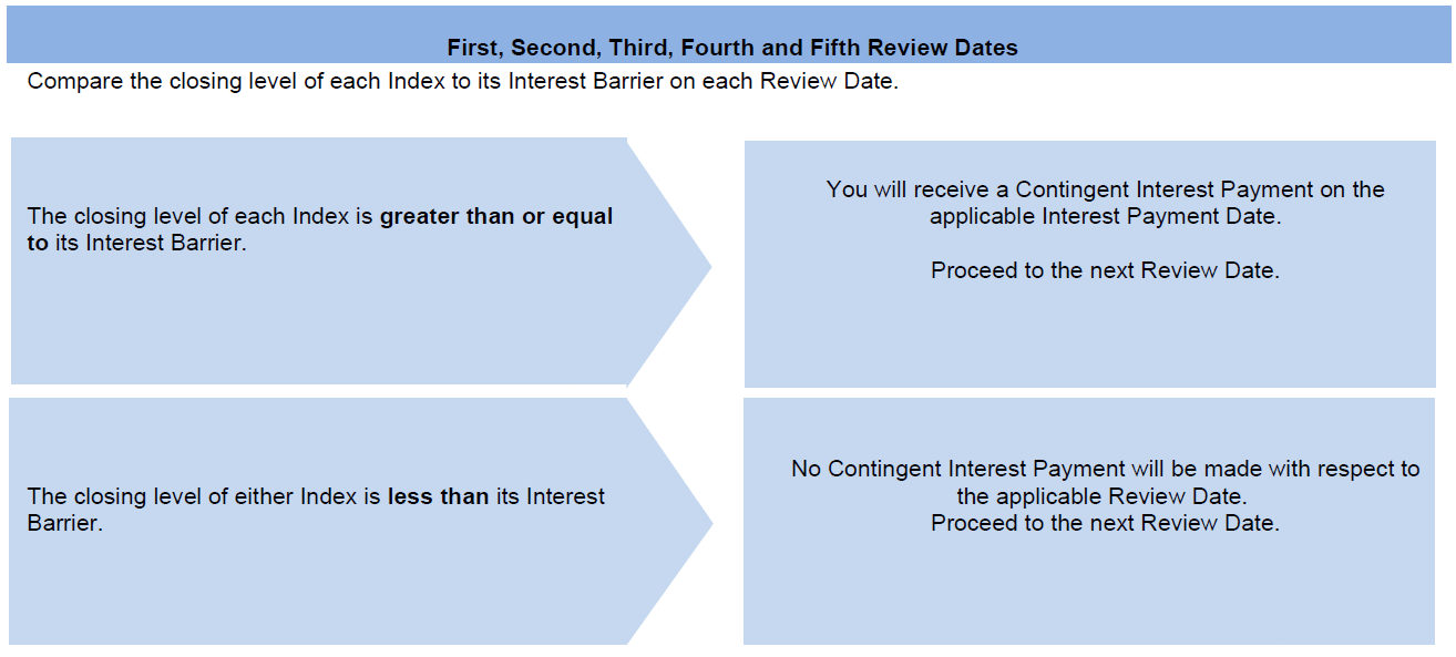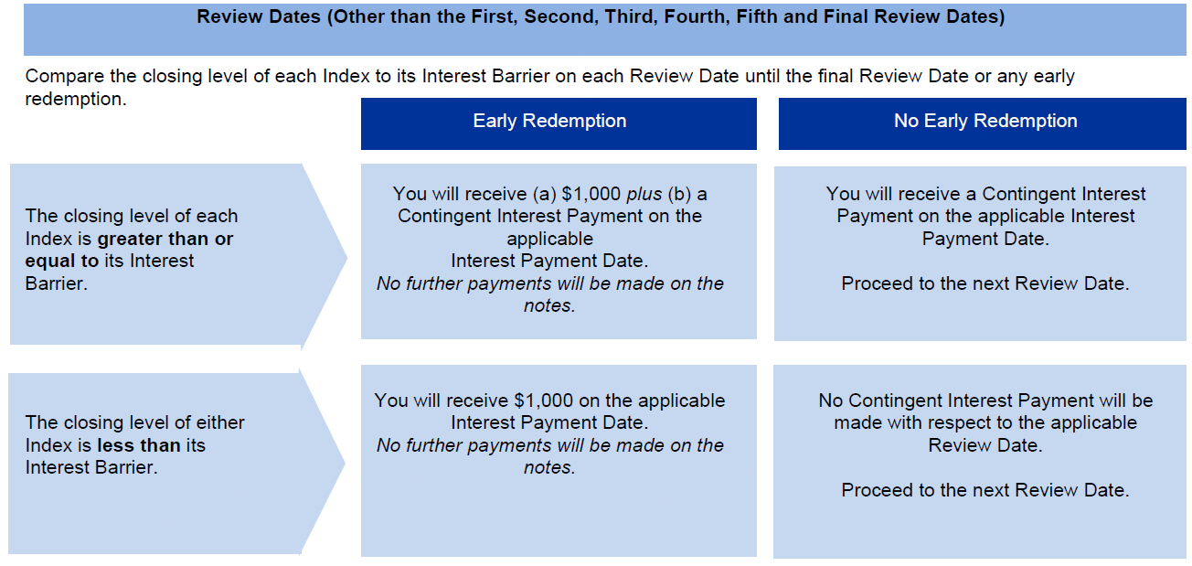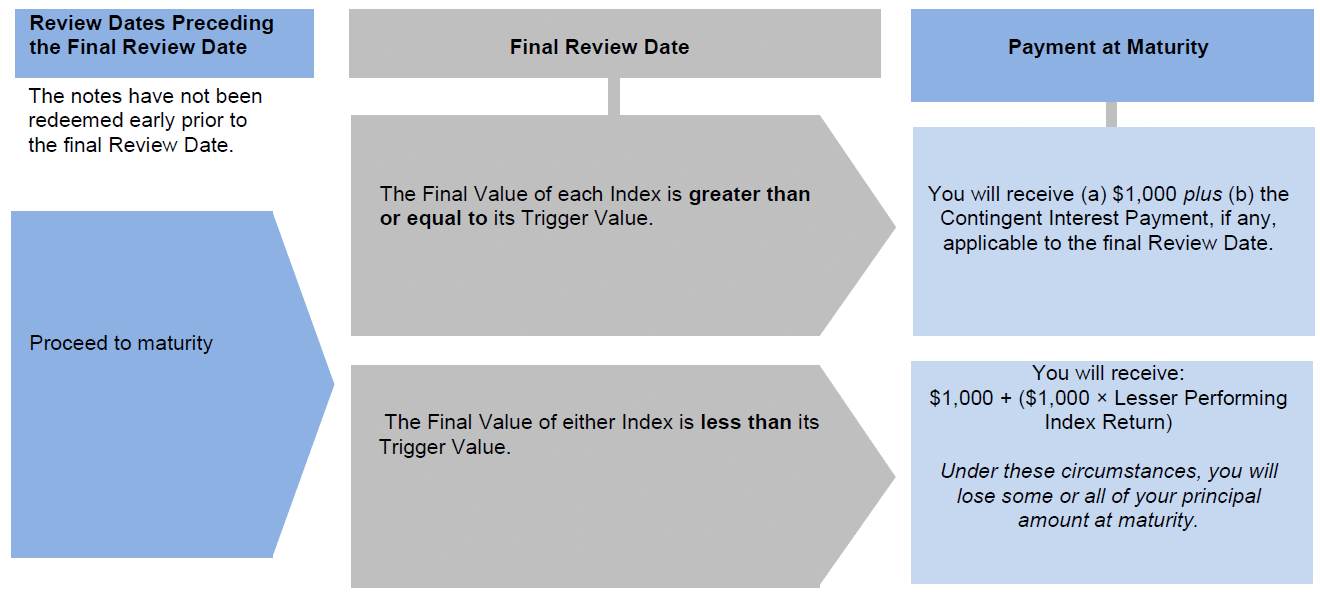 Early Redemption: We, at our election, may redeem the notes early, in whole but not in part, on any of the Interest Payment Dates (other than the first, second, third, fourth, fifth and final Interest Payment Dates) at a price, for each $1,000 principal amount note, equal to (a) $1,000 plus (b) the Contingent Interest Payment, if any, applicable to the immediately preceding Review Date. If we intend to redeem your notes early, we will deliver notice to The Depository Trust Company, or DTC, at least three business days before the applicable Interest Payment Date on which the notes are redeemed early. Payment at Maturity: If the notes have not been redeemed early and the Final Value of each Index is greater than or equal to its Trigger Value, you will receive a cash payment at maturity, for each $1,000 principal amount note, equal to (a) $1,000 plus (b) the Contingent Interest Payment, if any, applicable to the final Review Date. If the notes have not been redeemed early and the Final Value of either Index is less than its Trigger Value, your payment at maturity per $1,000 principal amount note will be calculated as follows: $1,000 + ($1,000 × Lesser Performing Index Return) If the notes have not been redeemed early and the Final Value of either Index is less than its Trigger Value, you will lose more than 40.00% of your principal amount at maturity and could lose all of your principal amount at maturity. Lesser Performing Index: The Index with the Lesser Performing Index Return Lesser Performing Index Return: The lower of the Index Returns of the Indices Index Return: With respect to each Index, (Final Value – Initial Value) Initial Value: With respect to each Index, the closing level of that Index on the Pricing Date Final Value: With respect to each Index, the closing level of that Index on the final Review Date