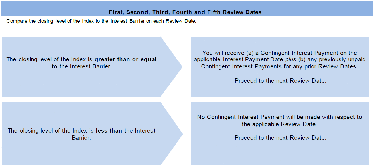 ●If the closing level of the Index is greater than or equal to the Interest Barrier on any Review Date, investors will receive, in addition to the Contingent Interest Payment with respect to that Review Date, any previously unpaid Contingent Interest Payments for prior Review Dates.