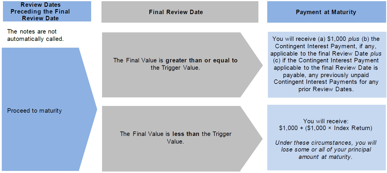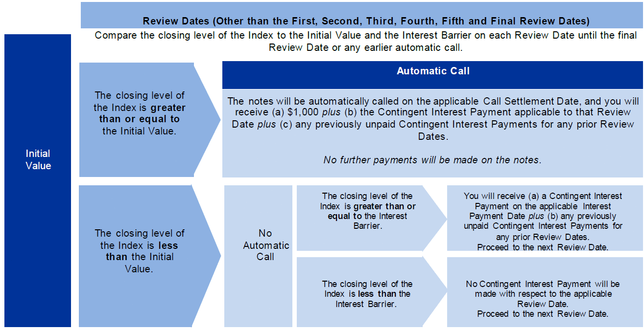 Automatic Call: If the closing level of the Index on any Review Date (other than the first, second, third, fourth, fifth and final Review Dates) is greater than or equal to the Initial Value, the notes will be automatically called for a cash payment, for each $1,000 principal amount note, equal to (a) $1,000 plus (b) the Contingent Interest Payment applicable to that Review Date plus (c) any previously unpaid Contingent Interest Payments for any prior Review Dates, payable on the applicable Call Settlement Date. No further payments will be made on the notes. Payment at Maturity: If the notes have not been automatically called and the Final Value is greater than or equal to the Trigger Value, you will receive a cash payment at maturity, for each $1,000 principal amount note, equal to (a) $1,000 plus (b) the Contingent Interest Payment, if any, applicable to the final Review Date plus (c) if the Contingent Interest Payment applicable to the final Review Date is payable, any previously unpaid Contingent Interest Payments for any prior Review Dates. If the notes have not been automatically called and the Final Value is less than the Trigger Value, your payment at maturity per $1,000 principal amount note will be calculated as follows: $1,000 + ($1,000 × Index Return) If the notes have not been automatically called and the Final Value is less than the Trigger Value, you will lose more than 40.00% of your principal amount at maturity and could lose all of your principal amount at maturity. Index Return: (Final Value – Initial Value) Initial Value: The closing level of the Index on the Pricing Date Final Value: The closing level of the Index on the final Review Date