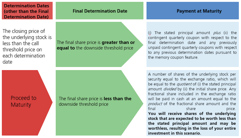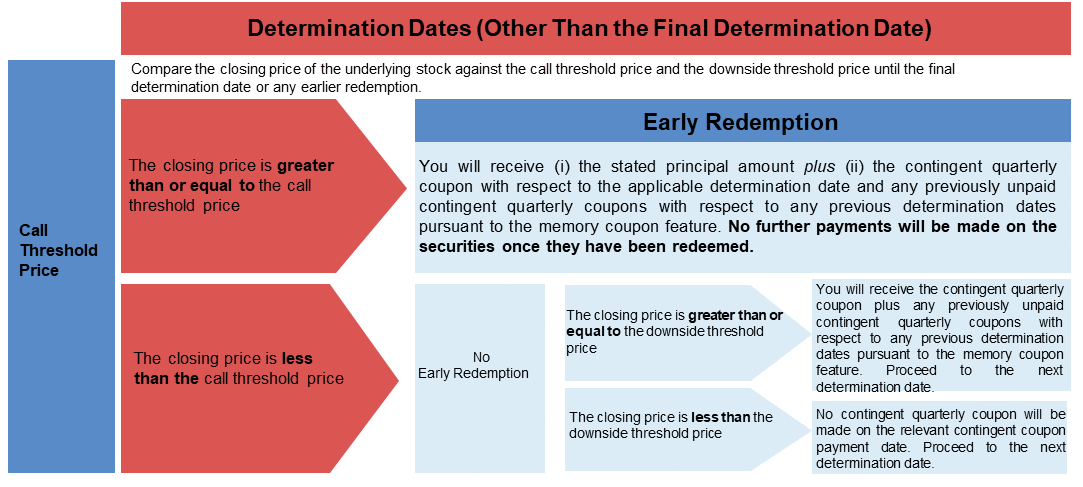 If the closing price of the underlying stock on any determination date other than the final determination date is greater than or equal to the call threshold price, the securities will be automatically redeemed for an amount per security equal to the early redemption payment on the first contingent coupon payment date immediately following the related determination date. No further payments will be made on the securities once they have been redeemed. |