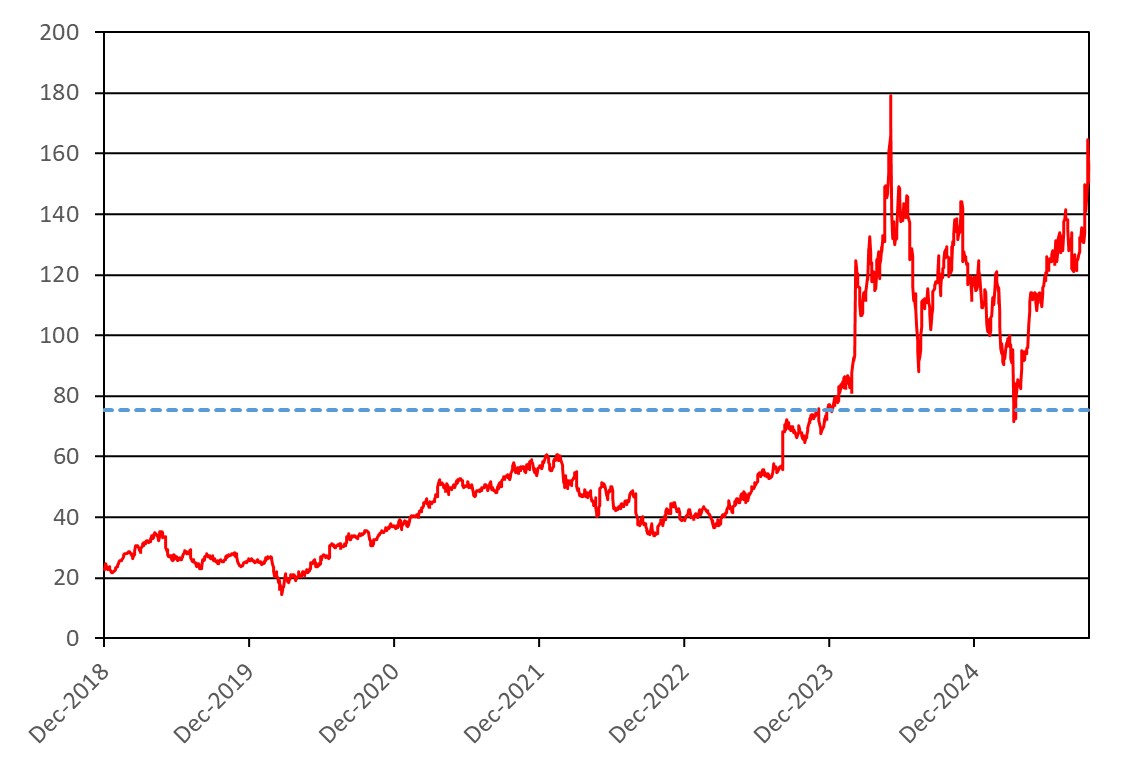The graph below illustrates the performance of the underlying asset from December 26, 2018 through October 10, 2025, based on the daily closing levels as reported by Bloomberg, without independent verification. BNS has not conducted any independent review or due diligence of publicly available information obtained from Bloomberg. The closing level of the underlying asset on October 10, 2025 was $150.57. The dotted line represents the coupon barrier and downside threshold of $75.29, which is equal to 50.00% of the initial level. Past performance of the underlying asset is not indicative of the future performance of the underlying asset during the term of the Notes.