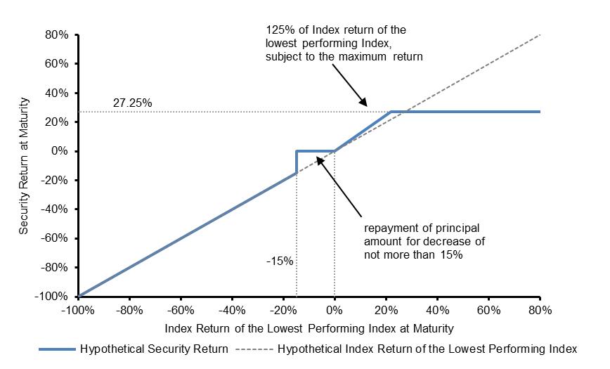 Maturity Payment Amount: | · If the ending level of the lowest performing Index is greater than its starting level: $1,000 plus the lesser of: (i) $1,000 × index return of the lowest performing Index × upside participation rate; and (ii) the maximum return; · If the ending level of the lowest performing Index is less than or equal to its starting level, but greater than or equal to its threshold level: $1,000; or · If the ending level of the lowest performing Index is less than its threshold level: $1,000 + ($1,000 × index return of the lowest performing Index) |