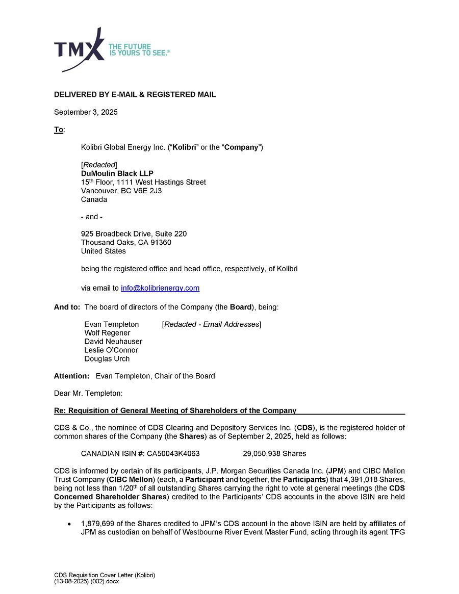 A Special General Meeting of Shareholders of Kolibri Global Energy Inc. (“Kolibri” or the “Company”) has been called by the Company to be held at the Hyatt Regency Westlake, 880 S. Westlake Blvd, Westlake Village, CA 91361, United States on Tuesday, November 25, 2025 at 9:00 a.m. (Pacific Time). A shareholder has requested that the meeting be held to vote on altering the Notice of Articles of the Company to cap the number of common shares that the Company (“Shares”) is authorized to issue (the “Share Limit”) at 37,367,894 (the “Proposed Resolution”).