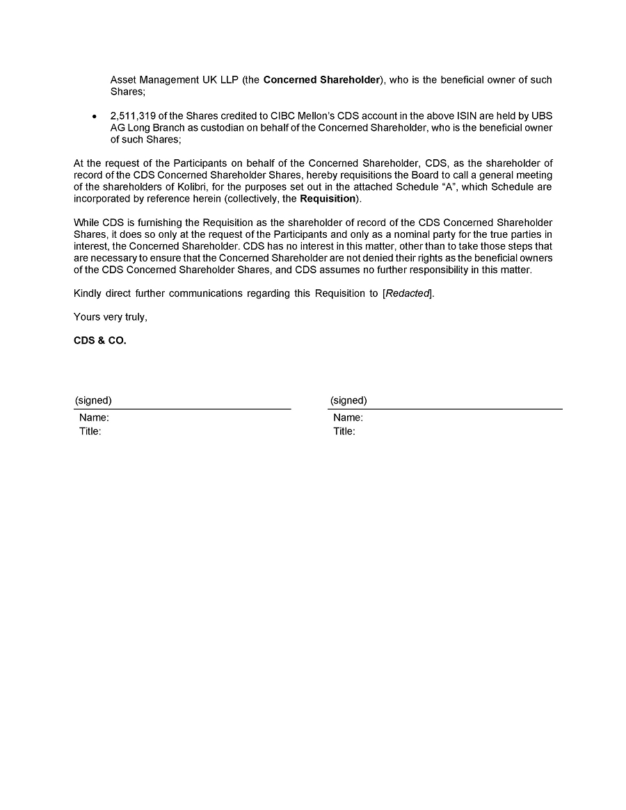 Additionally, Kolibri may use Broadridge Investor Communications Corporation’s QuickVote™ system to assist Shareholders with voting their Shares. Certain non-registered Shareholders who have not objected to the Company knowing who they are (non-objecting beneficial owners) may be contacted by the Company or its solicitation agents to conveniently obtain a vote directly over the phone.