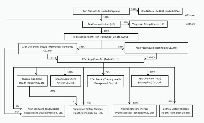 We are not a Chinese operating company but a Cayman Islands holding company. We conduct all of our operations through our PRC subsidiaries established in mainland China. On December 11, 2019, Bon Natural Life Limited was incorporated under the laws of the Cayman Islands as our offshore holding company to facilitate financing and offshore listing. Bon Natural Life Limited subsequently established a Wholly Foreign-Owned Enterprise (“WFOE”) in PRC China, Xi’an CMIT Information and Technology Co., Ltd. (“Xi’an CMIT”). Xi’an CMIT is wholly owned by our direct subsidiary in Hong Kong, Tea Essence. Due to PRC legal restrictions on foreign ownership in companies that engage in online sales China, we originally carried out our business through Xi’an App-Chem, a domestic PRC company, through a variable interest entity structure. Effective November 1, 2021, however, we reorganized our corporate structure in the PRC and are now the indirect sole shareholder of Xi’an App-Chem. Xi’an App-Chem is wholly-owned by two WFOE’s Xi’an CMIT and Xi’an Youpincui. Each of the WFOEs are in turn wholly-owned by Tea Essence, our direct wholly-owned subsidiary in Hong Kong. Xi’an App-Chem’s financial results are consolidated into our consolidated financial statements in accordance with U.S. GAAP because we have control over that entity by way of 100% equity ownership through Tea Essence, and in turn, Xi’an CMIT and Xi’an Youpincui.