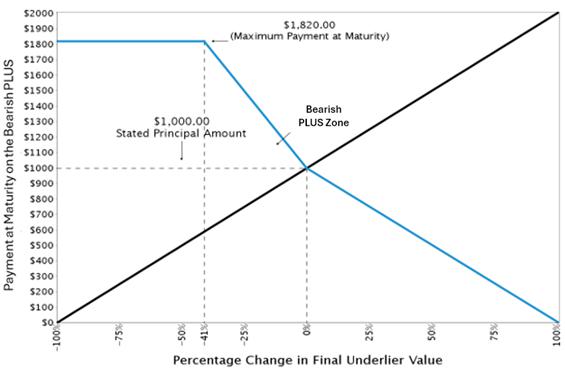 § | Positive Return Scenario. If the final underlier value is less than the initial underlier value, at maturity investors would receive the $1,000 stated principal amount plus a positive return reflecting 200% of the depreciation of the underlier from the initial underlier value to the final underlier value, subject to the maximum payment at maturity. Under the terms of the Bearish PLUS, investors would realize the maximum payment at maturity at a final underlier value of 59.00% of the initial underlier value. |