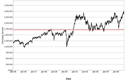 The following graphs set forth historical closing values of the Underliers for the period from January 1, 2015 to October 17, 2025. Each red line represents the Barrier Value of the relevant Underlier. We obtained the information in the graphs from Bloomberg Financial Markets, without independent investigation. We cannot give you assurance that the performance of the Underliers will result in the return of all of your initial investment.