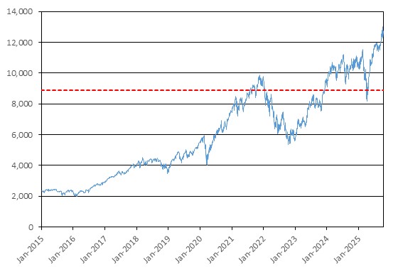 The graph below illustrates the performance of NDXT from January 1, 2015 through October 17, 2025, based on the daily closing levels as reported by Bloomberg, without independent verification. UBS has not conducted any independent review or due diligence of any publicly available information obtained from Bloomberg. The closing level of NDXT on October 17, 2025 was 12,717.14. The dotted line represents its coupon barrier and downside threshold of 8,902.00, which is equal to 70.00% of its initial level. Past performance of the underlying asset is not indicative of the future performance of the underlying asset during the term of the Notes.