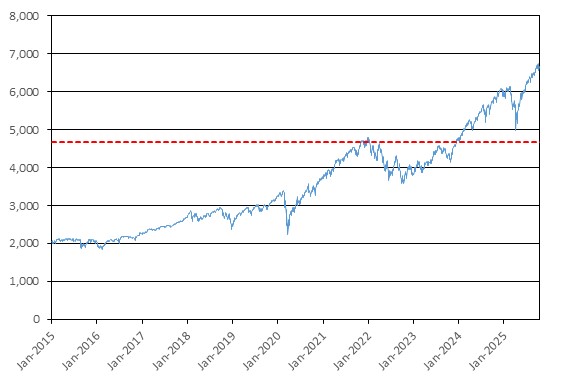 The graph below illustrates the performance of SPX from January 1, 2015 through October 17, 2025, based on the daily closing levels as reported by Bloomberg, without independent verification. UBS has not conducted any independent review or due diligence of any publicly available information obtained from Bloomberg. The closing level of SPX on October 17, 2025 was 6,664.01. The dotted line represents its coupon barrier and downside threshold of 4,664.81, which is equal to 70.00% of its initial level. Past performance of the underlying asset is not indicative of the future performance of the underlying asset during the term of the Notes.