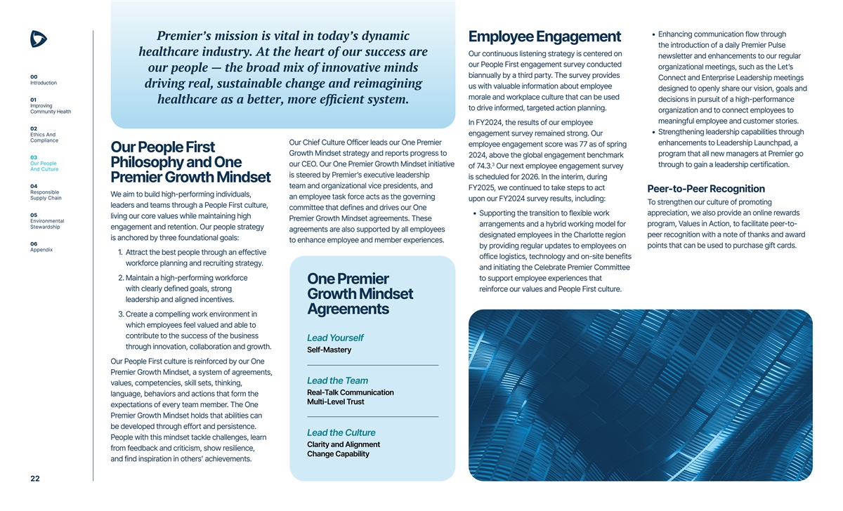 • Enhancing communication flow through Premier’s mission is vital in today’s dynamic Employee Engagement the introduction of a daily Premier Pulse healthcare industry. At the heart of our success are Our continuous listening strategy is centered on newsletter and enhancements to our regular our People First engagement survey conducted organizational meetings, such as the Let’s our people — the broad mix of innovative minds biannually by a third party. The survey provides 00 Connect and Enterprise Leadership meetings Introduction driving real, sustainable change and reimagining us with valuable information about employee designed to openly share our vision, goals and morale and workplace culture that can be used 01 decisions in pursuit of a high-performance healthcare as a better, more efficient system. Improving to drive informed, targeted action planning. organization and to connect employees to Community Health meaningful employee and customer stories. In FY2024, the results of our employee 02 • Strengthening leadership capabilities through Ethics And engagement survey remained strong. Our Compliance Our Chief Culture Officer leads our One Premier enhancements to Leadership Launchpad, a employee engagement score was 77 as of spring Our People First Growth Mindset strategy and reports progress to program that all new managers at Premier go 2024, above the global engagement benchmark 03 Our People 3 Philosophy and One our CEO. Our One Premier Growth Mindset initiative through to gain a leadership certification. of 74.3. Our next employee engagement survey And Culture is steered by Premier’s executive leadership is scheduled for 2026. In the interim, during Premier Growth Mindset 04 team and organizational vice presidents, and FY2025, we continued to take steps to act Peer-to-Peer Recognition Responsible We aim to build high-performing individuals, Supply Chain an employee task force acts as the governing upon our FY2024 survey results, including: To strengthen our culture of promoting leaders and teams through a People First culture, committee that defines and drives our One • Supporting the transition to flexible work appreciation, we also provide an online rewards 05 living our core values while maintaining high Premier Growth Mindset agreements. These Environmental arrangements and a hybrid working model for program, Values in Action, to facilitate peer-to- Stewardship engagement and retention. Our people strategy agreements are also supported by all employees designated employees in the Charlotte region peer recognition with a note of thanks and award is anchored by three foundational goals: to enhance employee and member experiences. 06 by providing regular updates to employees on points that can be used to purchase gift cards. Appendix 1. Attract the best people through an effective office logistics, technology and on-site benefits workforce planning and recruiting strategy. and initiating the Celebrate Premier Committee 2. Maintain a high-performing workforce to support employee experiences that One Premier with clearly defined goals, strong reinforce our values and People First culture. Growth Mindset leadership and aligned incentives. Agreements 3. Create a compelling work environment in which employees feel valued and able to contribute to the success of the business Lead Yourself through innovation, collaboration and growth. Self-Mastery Our People First culture is reinforced by our One Premier Growth Mindset, a system of agreements, Lead the Team values, competencies, skill sets, thinking, Real-Talk Communication language, behaviors and actions that form the Multi-Level Trust expectations of every team member. The One Premier Growth Mindset holds that abilities can be developed through effort and persistence. Lead the Culture People with this mindset tackle challenges, learn Clarity and Alignment from feedback and criticism, show resilience, Change Capability and find inspiration in others’ achievements. 22
