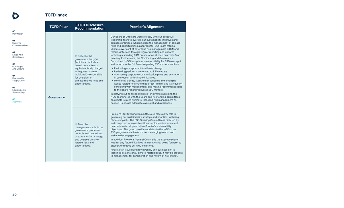 TCFD Index TCFD Disclosure TCFD Pillar Premier’s Alignment Recommendation 00 Introduction Our Board of Directors works closely with our executive leadership team to oversee our sustainability initiatives and 01 Improving business practices, which include the management of climate Community Health risks and opportunities as appropriate. Our Board retains ultimate oversight of enterprise risk management (ERM) and 02 remains informed through regular reporting and updates, Ethics And including a standing ERM presentation at each quarterly Board a) Describe the Compliance meeting. Furthermore, the Nominating and Governance governance body(s) Committee (NGC) has primary responsibility for ESG oversight (which can include a 03 and reports to the full Board regarding ESG matters, such as: board, committee or Our People equivalent body charged • Evaluating our approach to climate change. And Culture with governance) or • Reviewing performance related to ESG matters. individual(s) responsible • Overseeing corporate communication plans and any reports 04 for oversight of in connection with climate initiatives. Responsible Supply Chain climate-related risks and • Monitoring trends, stockholder concerns and emerging opportunities. issues related to climate that affect Premier and its industry; consulting with management; and making recommendations 05 Environmental to the Board regarding overall ESG matters. Stewardship In carrying out its responsibilities for climate oversight, the NGC coordinates with the Board and its standing committees Governance 06 on climate-related subjects, including risk management as Appendix needed, to ensure adequate oversight and awareness. Premier’s ESG Steering Committee also plays a key role in governing our sustainability strategy and priorities, including climate impacts. The ESG Steering Committee is directed by and composed of cross-functional senior leaders who meet b) Describe quarterly to develop and drive Premier’s sustainability management’s role in the objectives. The group provides updates to the NGC on our governance processes, ESG program and climate matters, emerging trends, and controls and procedures stakeholder engagement. used to monitor, manage and oversee climate- In addition, Premier’s General Counsel is the executive-level related risks and lead for any future initiatives to manage and, going forward, to opportunities. attempt to reduce our GHG emissions. Finally, if an issue being reviewed by any business unit is identified as a material, climate-related issue, it may be brought to management for consideration and review of risk impact. 40