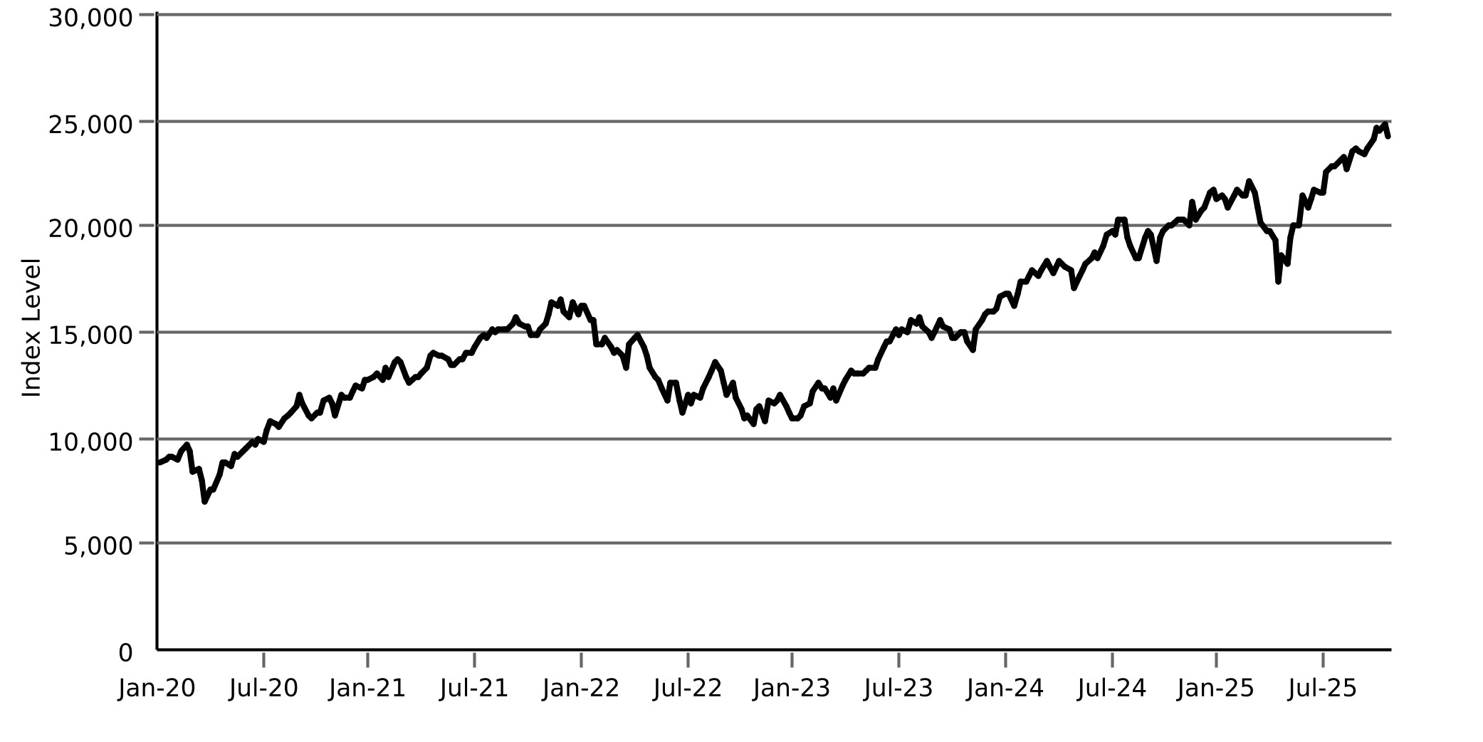 The following graphs set forth the historical performance of each Index based on the weekly historical closing levels from January 3, 2020 through October 10, 2025. The closing level of the Dow Jones Industrial Average® on October 16, 2025 was 45,952.24. The closing level of the Nasdaq-100 Index® on October 16, 2025 was 24,657.24. The closing level of the Russell 2000® Index on October 16, 2025 was 2,467.015. We obtained the closing levels above and below from the Bloomberg Professional® service (“Bloomberg”), without independent verification.