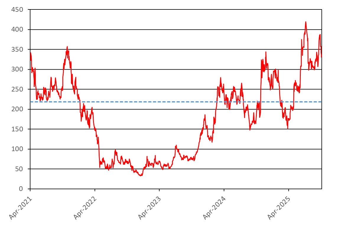 We obtained the information regarding the historical performance of the Reference Asset in the graph below from Bloomberg, without independent review or verification. The graph below illustrates the performance of the Reference Asset from April 14, 2021 through October 17, 2025. The Closing Value of the Reference Asset on the Trade Date was $336.02. The dotted line represents the Contingent Coupon Barrier Value and Buffer Value of $218.41, which is equal to 65.00% of the Initial Value.
