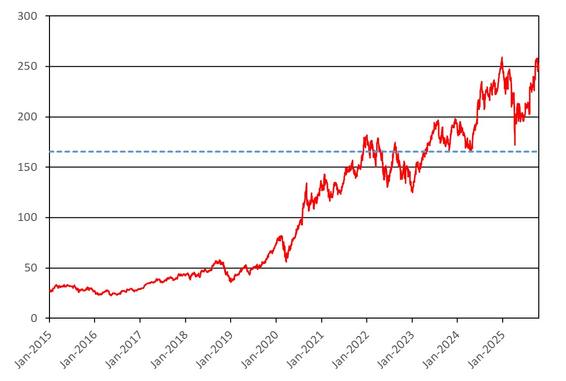 The graph below illustrates the performance of Apple’s common stock from January 1, 2015 through October 17, 2025, based on the daily closing levels as reported by Bloomberg, without independent verification. BNS has not conducted any independent review or due diligence of publicly available information obtained from Bloomberg. The closing level of Apple’s common stock on October 17, 2025 was $252.29. The dotted line represents the coupon barrier and downside threshold of $165.38, which is equal to 65.55% of the initial level. Past performance of the underlying asset is not indicative of the future performance of the underlying asset during the term of the Notes.