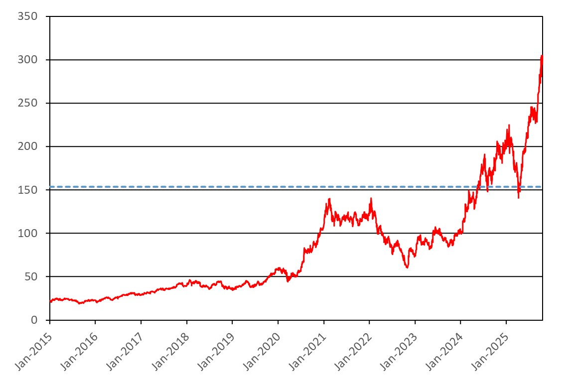The graph below illustrates the performance of Taiwan Semiconductor’s American depositary receipts from January 1, 2015 through October 17, 2025, based on the daily closing levels as reported by Bloomberg, without independent verification. BNS has not conducted any independent review or due diligence of publicly available information obtained from Bloomberg. The closing level of Taiwan Semiconductor’s American depositary receipts on October 17, 2025 was $295.08. The dotted line represents the coupon barrier and downside threshold of $153.29, which is equal to 51.95% of the initial level. Past performance of the underlying asset is not indicative of the future performance of the underlying asset during the term of the Notes.