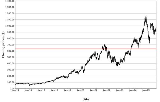 The following graph sets forth historical closing values of the Underlier for the period from January 1, 2015 to October 17, 2025. The red line represents the Coupon Threshold and Barrier Value. We obtained the information in the graph from Bloomberg Financial Markets, without independent investigation. We cannot give you assurance that the performance of the Underlier will result in the return of all of your initial investment.