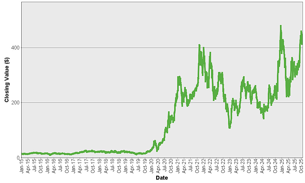 The graph below shows the closing value of Tesla, Inc. for each day such value was available from January 2, 2015 to October 20, 2025. We obtained the closing values from Bloomberg L.P., without independent verification. If certain corporate transactions occurred during the historical period shown below, including, but not limited to, spin-offs or mergers, then the closing values shown below for the period prior to the occurrence of any such transaction have been adjusted by Bloomberg L.P. as if any such transaction had occurred prior to the first day in the period shown below. You should not take historical closing values as an indication of future performance.