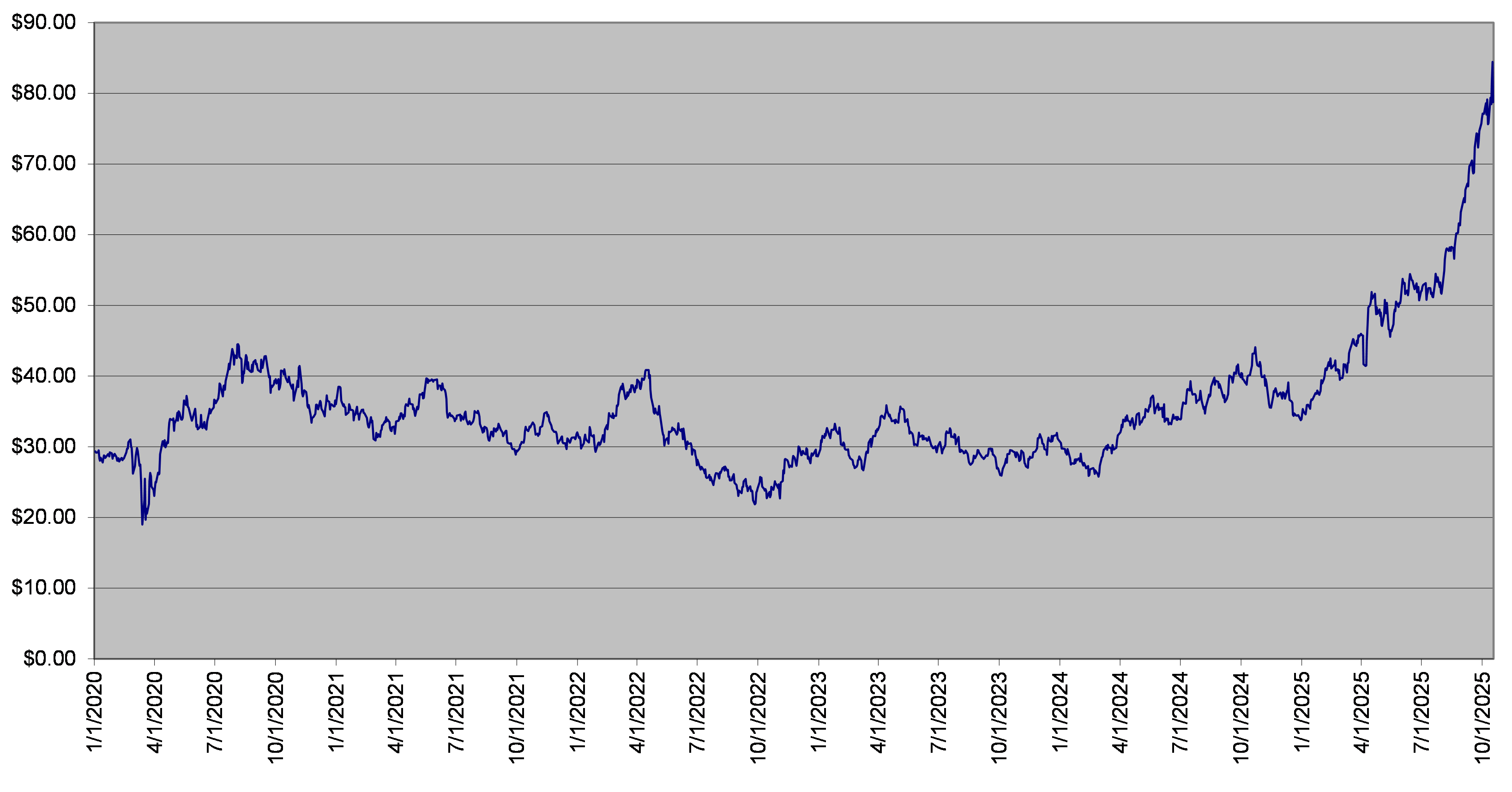 GDX Fund Daily Closing Levels January 1, 2020 to October 17, 2025 |