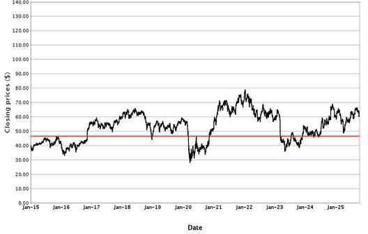 The following graph sets forth historical closing values of the Underlier for the period from January 1, 2015 to October 14, 2025. The red line represents the Coupon Threshold and Barrier Value. We obtained the information in the graph from Bloomberg Financial Markets, without independent investigation. We cannot give you assurance that the performance of the Underlier will result in the return of all of your initial investment.