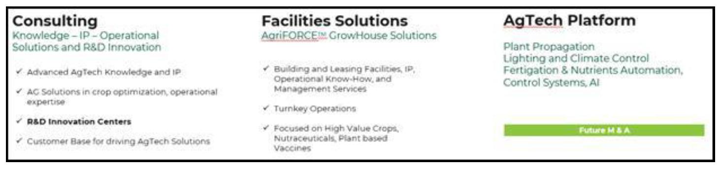 While Solutions’ legacy focus was to operate in the plant based pharmaceutical, nutraceutical, and other high value crop markets using its unique proprietary facility design and hydroponics based automated growing system that enable cultivators to effectively grow crops in a controlled environment (“FORCEGH+™”). The Company has designed FORCEGH+™ facilities to produce in virtually any environmental condition and to optimize crop yields to as near their full genetic potential possible whilst substantially eliminating the need for the use of pesticides and/or irradiation. The Company has changed its focus to broaden the use of its proprietary intellectual property across multiple industries. For instance, the Company through its RCS purchase, is now able to utilize that technology to deliver solutions across multiple industries, including not only agriculture, but other industries including hospitality, commercial applications, education institutions, residential real estate and transportation.