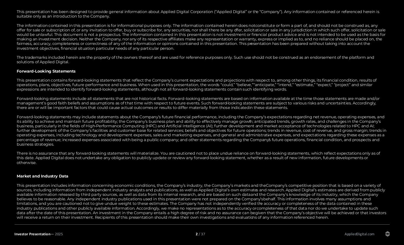 Investor Presentation— 2025 AppliedDigital.com This presentation has been designed to provide general information about Applied Digital Corporation (“Applied Digital” or the “Company”). Any information contained or referenced herein is suitable only as an introduction to the Company. The information contained in this presentation is for informational purposes only. The information contained herein does not constitute or form a part of, and should not be construed as, any offer for sale or subscription of, or any invitation to offer, buy or subscribe for, any securities, nor shall there be any offer, solicitation or sale in any jurisdiction in which such offer, solicitation or sale would be unlawful. This document is not a prospectus. The information contained in this presentation is not investment or financial product advice and is not intended to be used as the basis for making an investment decision. Neither the Company, nor any of its respective affiliates make any representation or warranty, express or implied as to, and no reliance should be placed on, the fairness, accuracy, completeness or correctness of any of the information or opinions contained in this presentation. This presentation has been prepared without taking into account the investment objectives, financial situation particular needs of any particular person. The trademarks included herein are the property of the owners thereof and are used for reference purposes only. Such use should not be construed as an endorsement of the platform and solutions of Applied Digital. Forward-Looking Statements This presentation contains forward-looking statements that reflect the Company’s current expectations and projections with respect to, among other things, its financial condition, results of operations, plans, objectives, future performance and business. When used in this presentation, the words “could,” “believe,”“anticipate,” “intend,” “estimate,” “expect,” “project” and similar expressions are intended to identify forward-looking statements, although not all forward-looking statements contain such identifying words. Forward-looking statements include all statements that are not historical facts. Forward-looking statements are based on information available at the time those statements are made and/or management’s good faith beliefs and assumptions as of that time with respect to future events. Such forward-looking statements are subject to various risks and uncertainties. Accordingly, there are or will be important factors that could cause actual outcomes or results to differ materially from those indicated in these statements. Forward-looking statements may include statements about the Company’s future financial performance, including the Company’s expectations regarding net revenue, operating expenses, and its ability to achieve and maintain future profitability; the Company’s business plan and ability to effectively manage growth; anticipated trends, growth rates, and challenges in the Company’s business, particularly in the fields of High-Performance Computing (HPC) and Artificial Intelligence (AI); further development and market acceptance of technologies related to HPC and AI; further development of the Company’s facilities and customer base for related services; beliefs and objectives for future operations; trends in revenue, cost of revenue, and gross margin; trends in operating expenses, including technology and development expenses, sales and marketing expenses, and general and administrative expenses, and expectations regarding these expenses as a percentage of revenue; increased expenses associated with being a public company; and other statements regarding the Company’s future operations, financial condition, and prospects and business strategies. There is no assurance that any forward-looking statements will materialize. You are cautioned not to place undue reliance on forward-looking statements, which reflect expectations only as of this date. Applied Digital does not undertake any obligation to publicly update or review any forward-looking statement, whether as a result of new information, future developments or otherwise. Market and Industry Data This presentation includes information concerning economic conditions, the Company’s industry, the Company’s markets and the Company’s competitive position that is based on a variety of sources, including information from independent industry analysts and publications, as well as Applied Digital’s own estimates and research. Applied Digital’s estimates are derived from publicly available information released by third party sources, as well as data from its internal research, and are based on such dataand the Company’s knowledge of its industry, which the Company believes to be reasonable. Any independent industry publications used in this presentation were not prepared on the Company’sbehalf. This information involves many assumptions and limitations, and you are cautioned not to give undue weight to these estimates. The Company has not independently verified the accuracy or completeness of the data contained in these industry publications and other publicly available information. Accordingly, we make no representations as to the accuracy orcompleteness of that data nor do we undertake to update such data after the date of this presentation. An investment in the Company entails a high degree of risk and no assurance can be given that the Company’s objective will be achieved or that investors will receive a return on their investment. Recipients of this presentation should make their own investigations and evaluations of any information referenced herein. 2 / 37