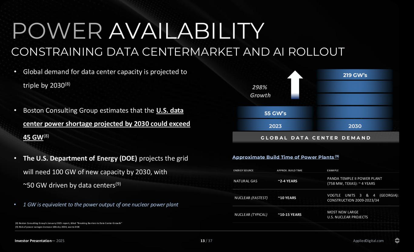 AppliedDigital.comInvestor Presentation— 2025 (8) Boston Consulting Group’s Janua ry 2 025 report, titled “Breaking Ba rriers to Da ta Cente r Grow th” (9) Risk of pow er outages increase 100 x by 203 0, wa rns D OE POWER AVAILABILITY CONSTRAINING DATA CENTERMARKET AND AI ROLLOUT • Boston Consulting Group estimate that the U.S. data center power shortage could exceed 45 GW is projected by 2030(8) • The U.S. Department of Energy (DOE) projects the grid will need 100 GW of new capacity by 2030, with ~50 GW driven by data centers(8) • 1 GW is equivalent to the power output of one nuclear power plant • Global demand for data center capacity is projected to triple by 2030(8) • Boston Consulting Group estimates that the U.S. data center power shortage projected by 2030 could exceed 45 GW(8) • The U.S. Department of Energy (DOE) projects the grid will need 100 GW of new capacity by 2030, with ~50 GW driven by data centers(9) • 1 GW is equivalent to the power output of one nuclear power plant 2023 2030 55 GW’s 219 GW’s 298% Growth G L O B A L D A T A C E N T E R D E M A N D NATURAL GAS ~2-4 YEARS PANDA TEMPLE II POWER PLANT (758 MW, TEXAS): ~ 4 YEARS NUCLEAR (FASTEST) ~10 YEARS VOGTLE UNITS 3 & 4 (GEORGIA): CONSTRUCTION 2009-2023/34 NUCLEAR (TYPICAL) ~10-15 YEARS MOST NEW LARGE U.S. NUCLEAR PROJECTS Approximate Build Time of Power Plants (9) 13 / 37