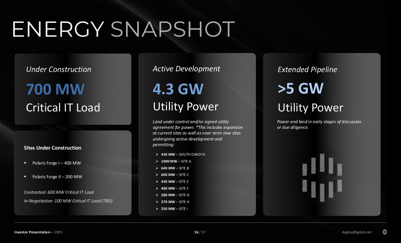 AppliedDigital.com Title AI FACTORIES FROM POPULATION TO POWER Investor Presentation— 2025 Hyperscalers Pivot Inland • Traditional Data Centers • Hyperscale Data Centers • Applied Digital Data Centers POLARIS FORGE 1 ELLENDALE, NORTH DAKOTA 400 MW POLARIS FORGE 2 HARWOOD, NORTH DAKOTA *200 MW under contract +100 MW under construction 300 MW Region *Critical IT Load Pipeline: >4 GW’s **Utility Power** *Critical Load: Critical IT Load refers to the amount of electrical powe r dedicated sole ly to the computing equipme nt (such as servers , stora ge, and netw orking ge ar) w ithin a data center. It excludes supporting infrastructure like cooling, ** Pipeline includes powe r a greements a nd options on land - includes e xpansion at current sites a s well as near-term new sites undergoing active development and permitting Legend 15 / 37