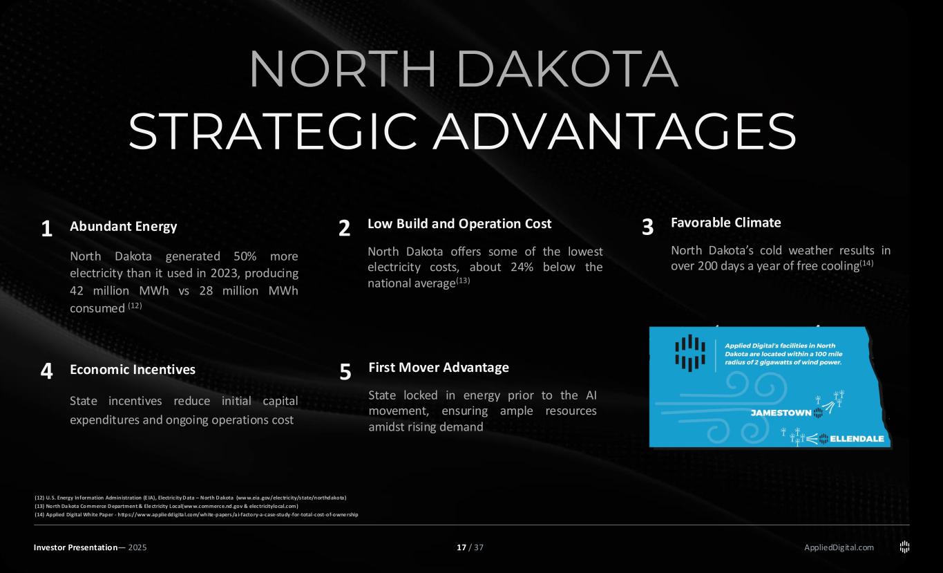 AppliedDigital.com NORTH DAKOTA STRATEGIC ADVANTAGES (12) U.S. Energy Information Administration (E IA), Electricity D ata – North D akota (ww w.eia .gov/electricity/state/northdakota) (13) North Da kota Commerce D epartment & Ele ctricity Local(ww w.commerce.nd.gov & electricitylocal.com) (14) Applied Digital White Paper - https://ww w.applie ddigita l.com/white-papers/a i-factory-a-case-study-for-total-cost-of-owne rship Abundant Energy North Dakota generated 50% more electricity than it used in 2023, producing 42 million MWh vs 28 million MWh consumed (12) 1 Low Build and Operation Cost North Dakota offers some of the lowest electricity costs, about 24% below the national average(13) 2 Favorable Climate North Dakota’s cold weather results in over 200 days a year of free cooling(14) 3 Economic Incentives State incentives reduce initial capital expenditures and ongoing operations cost 4 First Mover Advantage State locked in energy prior to the AI movement, ensuring ample resources amidst rising demand 5 Investor Presentation— 2025 17 / 37