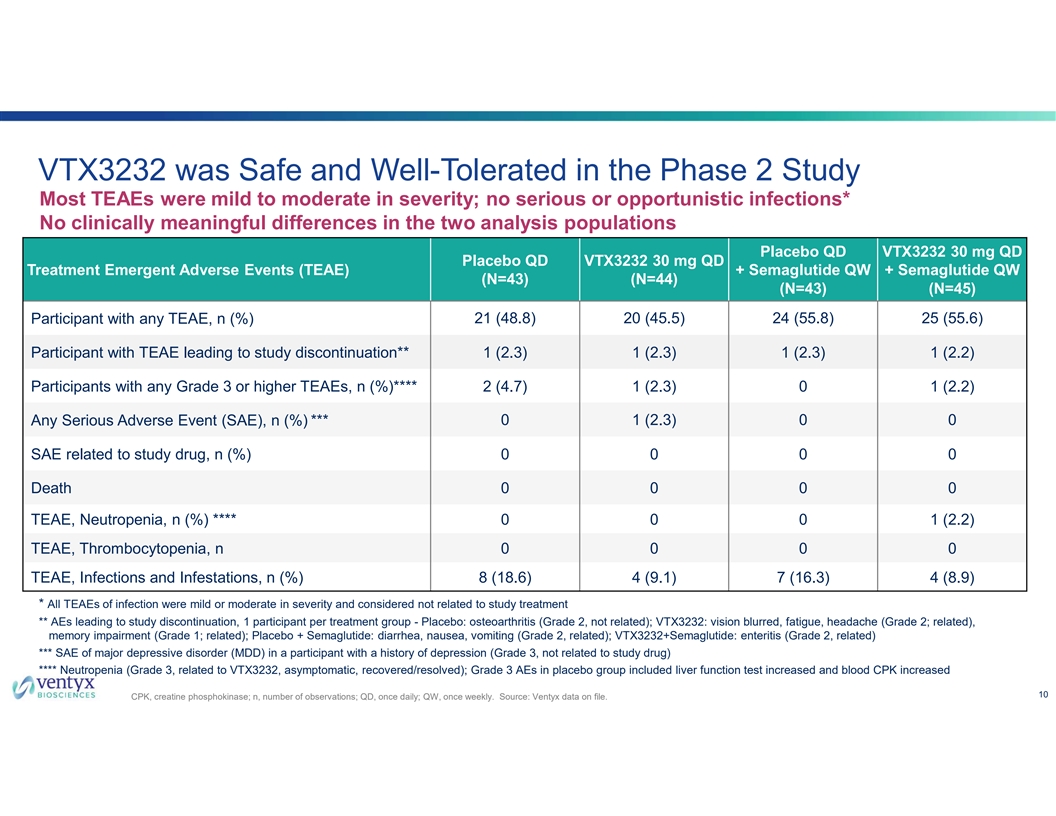 Baseline Characteristics Consistent with trial population and generally balanced across treatment arms Placebo QD VTX3232 30 mg QD Placebo QD VTX3232 QD 30 mg Total Baseline Characteristic + Semaglutide QW + Semaglutide QW (N=43) (N=44) (N=175) (N=43) (N=45) Age, years, mean (SD) 47.0 (13.5) 45.9 (13.5) 47.7 (13.4) 49.7 (14.7) 47.6 (13.7) Male, n (%) 10 (23.3) 10 (22.7) 9 (20.9) 10 (22.2) 39 (22.3) 33 (76.7) 34 (77.3) 34 (79.1) 35 (77.8) 136 (77.7) Female, n (%) Race, n (%) White 29 (67.4) 31 (70.5) 30 (69.8) 29 (64.4) 119 (68.0) Black/ African American 11 (25.6) 11 (25.0) 11 (25.6) 15 (33.3) 48 (27.4) 1 (2.3) 0 2 (4.7) 1 (2.2) 4 (2.3) American Indian/Alaska Native Asian 2 (4.7) 1 (2.3) 0 0 3 (1.7) Multiple 0 1 (2.3) 0 0 1 (0.6) 100.9 (12.7) 101.6 (17.1) 97.6 (14.2) 99.0 (17.1) 99.8 (15.4) Weight, kg, mean (SD) 2 BMI, kg/m , mean (SD) 36.3 (3.9) 36.0 (3.6) 35.9 (3.8) 36.1 (3.9) 36.1 (3.8) 45.9 (7.7) 45.1 (6.6) 45.4 (6.9) 44.8 (6.8) 45.3 (7.0) Body Fat, %, mean (SD) Liver Fat Content, %, mean (min-max) 8.3 (1.4; 27.0) 8.9 (1.3; 23.3) 8.5 (1.8; 29.7) 7.2 (0.7; 37.4) 8.2 (0.7; 37.4) IL-6, ng/L, median (IQR) 3.3 (2.8; 4.3) 4.1 (2.9; 5.6) 3.7 (2.8; 5.5) 3.8 (2.6; 4.9) 3.7 (2.8; 5.3) hsCRP, mg/L, median (IQR) 3.6 (1.9; 5.8) 4.8 (3.3; 7.5) 3.9 (2.6; 8.0) 3.7 (2.3; 7.0) 4.1 (2.5; 6.7) 9 BMI, body mass index; hsCRP, high-sensitivity C-reactive protein; IQR, interquartile range; N, number of participants; QD, once daily; SD, standard deviation; source: Ventyx data on file