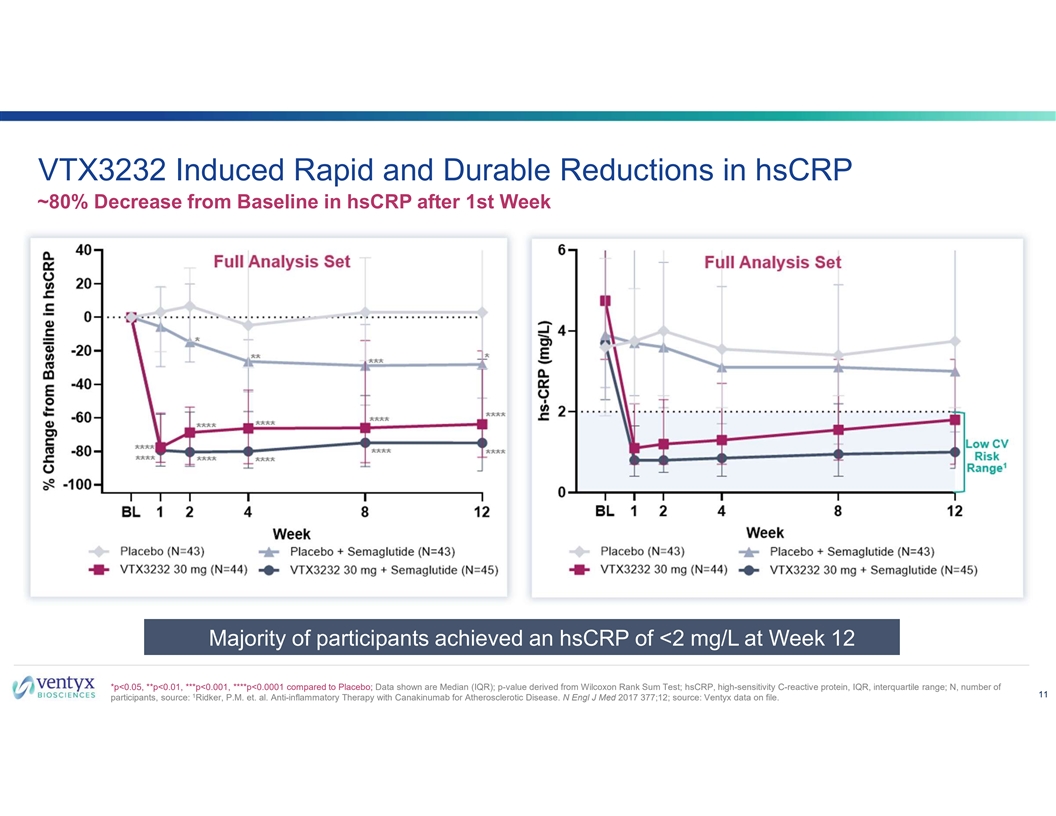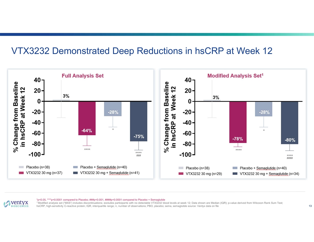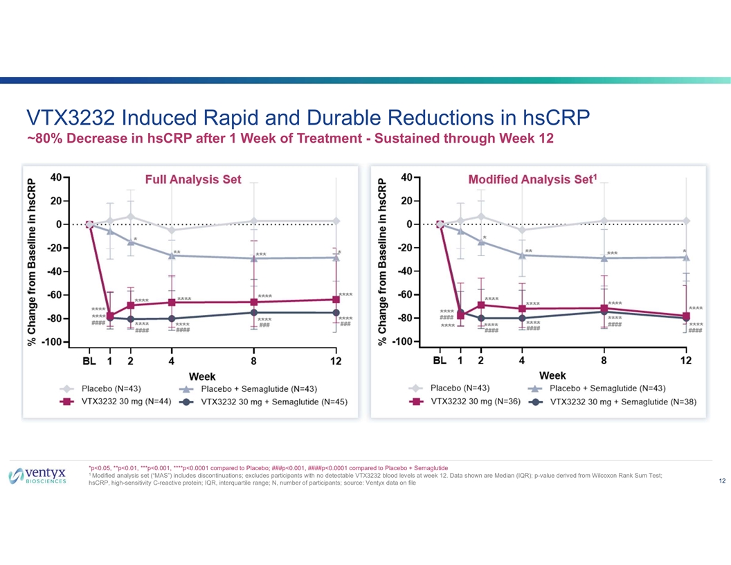 VTX3232 Induced Rapid and Durable Reductions in hsCRP ~80% Decrease in hsCRP after 1 Week of Treatment - Sustained through Week 12 *p<0.05, **p<0.01, ***p<0.001, ****p<0.0001 compared to Placebo; ###p<0.001, ####p<0.0001 compared to Placebo + Semaglutide 1 Modified analysis set (“MAS”) includes discontinuations; excludes participants with no detectable VTX3232 blood levels at week 12. Data shown are Median (IQR); p-value derived from Wilcoxon Rank Sum Test; 12 hsCRP, high-sensitivity C-reactive protein; IQR, interquartile range; N, number of participants; source: Ventyx data on file