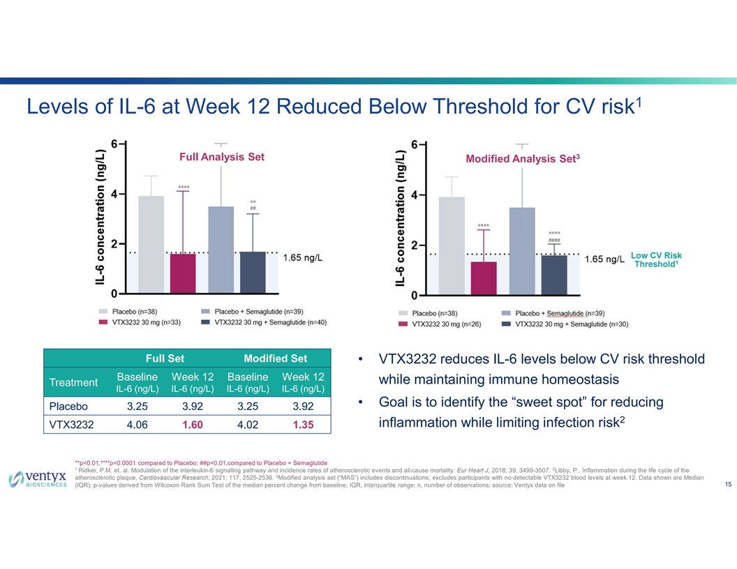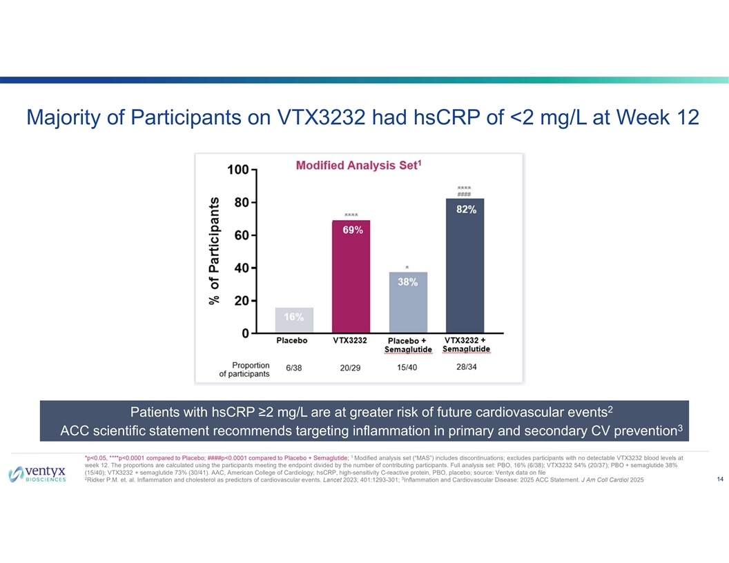 Majority of Participants on VTX3232 had hsCRP of <2 mg/L at Week 12 2 Patients with hsCRP ≥2 mg/L are at greater risk of future cardiovascular events 3 ACC scientific statement recommends targeting inflammation in primary and secondary CV prevention 1 *p<0.05, ****p<0.0001 compared to Placebo; ####p<0.0001 compared to Placebo + Semaglutide; Modified analysis set (“MAS”) includes discontinuations; excludes participants with no detectable VTX3232 blood levels at week 12. The proportions are calculated using the participants meeting the endpoint divided by the number of contributing participants. Full analysis set: PBO, 16% (6/38); VTX3232 54% (20/37); PBO + semaglutide 38% (15/40); VTX3232 + semaglutide 73% (30/41). AAC, American College of Cardiology; hsCRP, high-sensitivity C-reactive protein, PBO, placebo; source: Ventyx data on file 2 3 14 Ridker P.M. et. al. Inflammation and cholesterol as predictors of cardiovascular events. Lancet 2023; 401:1293-301; Inflammation and Cardiovascular Disease: 2025 ACC Statement. J Am Coll Cardiol 2025