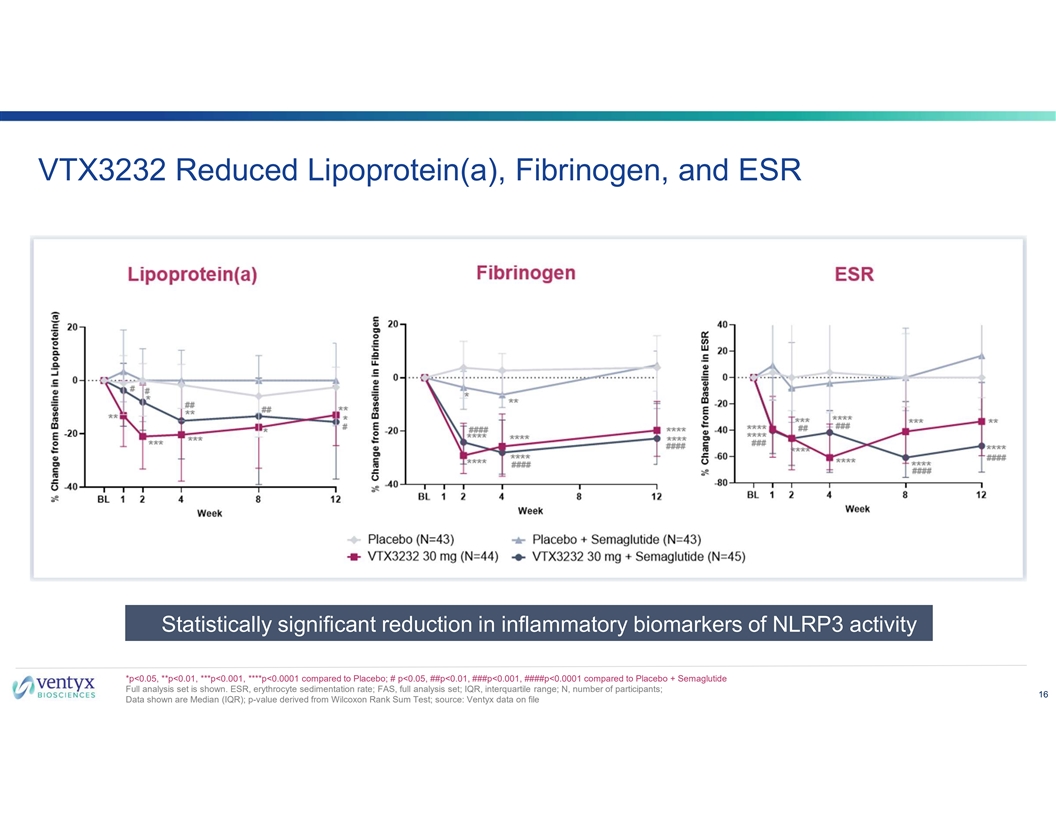 VTX3232 Reduced Lipoprotein(a), Fibrinogen, and ESR Statistically significant reduction in inflammatory biomarkers of NLRP3 activity *p<0.05, **p<0.01, ***p<0.001, ****p<0.0001 compared to Placebo; # p<0.05, ##p<0.01, ###p<0.001, ####p<0.0001 compared to Placebo + Semaglutide Full analysis set is shown. ESR, erythrocyte sedimentation rate; FAS, full analysis set; IQR, interquartile range; N, number of participants; 16 Data shown are Median (IQR); p-value derived from Wilcoxon Rank Sum Test; source: Ventyx data on file