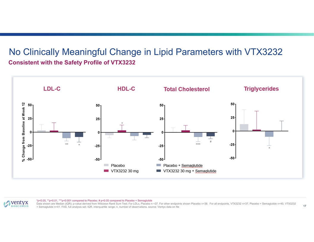 No Clinically Meaningful Change in Lipid Parameters with VTX3232 Consistent with the Safety Profile of VTX3232 *p<0.05, **p<0.01, ***p<0.001 compared to Placebo; # p<0.05 compared to Placebo + Semaglutide Data shown are Median (IQR); p-value derived from Wilcoxon Rank Sum Test; For LDLc, Placebo n =37. For other endpoints shown Placebo n=38. For all endpoints, VTX3232 n=37, Placebo + Semaglutide n=40, VTX3232 17 + Semaglutide n=41. FAS, full analysis set; IQR, interquartile range; n, number of observations. source: Ventyx data on file
