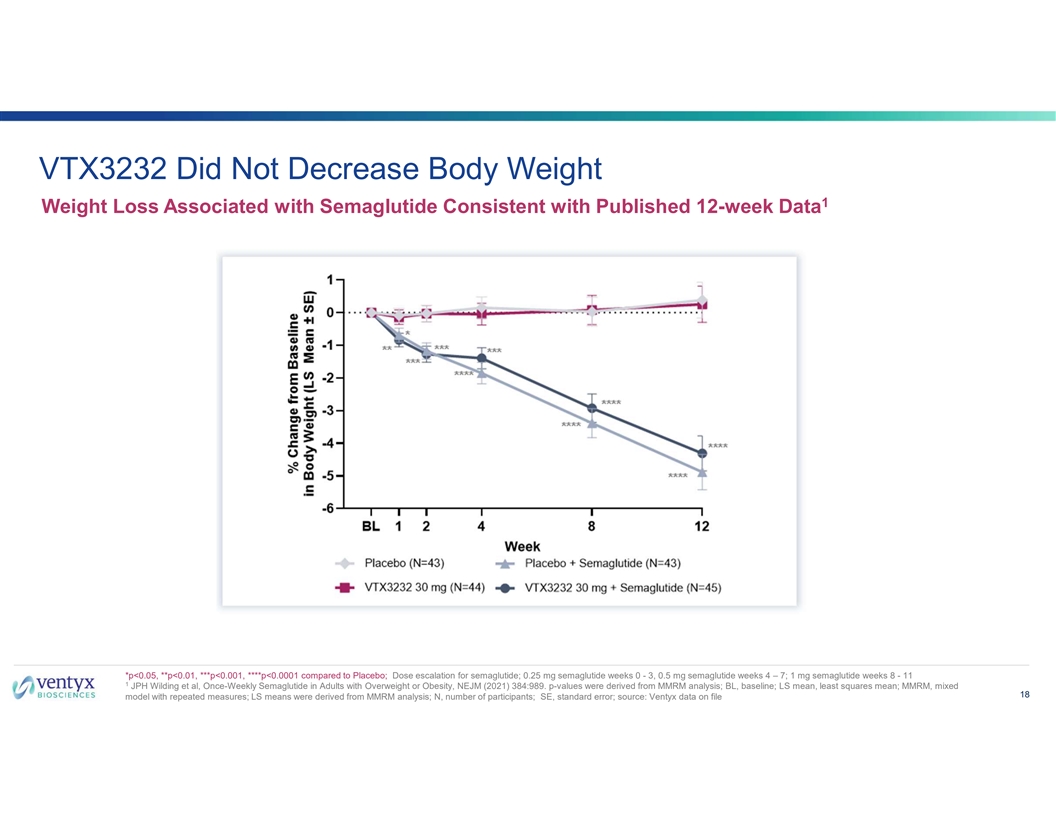 VTX3232 was Safe and Well-Tolerated in the Phase 2 Study Most TEAEs were mild to moderate in severity; no serious or opportunistic infections* No clinically meaningful differences in the two analysis populations Placebo QD VTX3232 30 mg QD Placebo QD VTX3232 30 mg QD Treatment Emergent Adverse Events (TEAE) + Semaglutide QW + Semaglutide QW (N=43) (N=44) (N=43) (N=45) Participant with any TEAE, n (%) 21 (48.8) 20 (45.5) 24 (55.8) 25 (55.6) Participant with TEAE leading to study discontinuation** 1 (2.3) 1 (2.3) 1 (2.3) 1 (2.2) Participants with any Grade 3 or higher TEAEs, n (%)**** 2 (4.7) 1 (2.3) 0 1 (2.2) Any Serious Adverse Event (SAE), n (%) *** 0 1 (2.3) 0 0 SAE related to study drug, n (%) 0 0 0 0 Death 0 0 0 0 TEAE, Neutropenia, n (%) **** 0 0 0 1 (2.2) TEAE, Thrombocytopenia, n 0 0 0 0 TEAE, Infections and Infestations, n (%) 8 (18.6) 4 (9.1) 7 (16.3) 4 (8.9) * All TEAEs of infection were mild or moderate in severity and considered not related to study treatment ** AEs leading to study discontinuation, 1 participant per treatment group - Placebo: osteoarthritis (Grade 2, not related); VTX3232: vision blurred, fatigue, headache (Grade 2; related), memory impairment (Grade 1; related); Placebo + Semaglutide: diarrhea, nausea, vomiting (Grade 2, related); VTX3232+Semaglutide: enteritis (Grade 2, related) *** SAE of major depressive disorder (MDD) in a participant with a history of depression (Grade 3, not related to study drug) **** Neutropenia (Grade 3, related to VTX3232, asymptomatic, recovered/resolved); Grade 3 AEs in placebo group included liver function test increased and blood CPK increased 10 CPK, creatine phosphokinase; n, number of observations; QD, once daily; QW, once weekly. Source: Ventyx data on file.